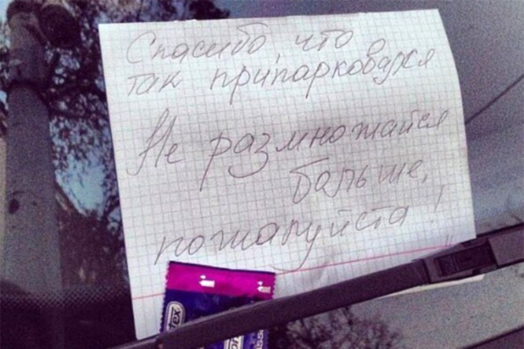 Можно оставлять записки под дворниками. Приготовьте их заранее, чтобы не сочинять на ходу. Чем больше, тем лучше. Содержание записок зависит только от вашей фантазии и воспитания. Если увидели автомобиль на тротуаре впервые, можно вежливо попросить его там больше не ставить. А если кто-то осложняет вам жизнь регулярно, не грех пригрозить отправкой снимка авто в ГУОБДД и СМИ.