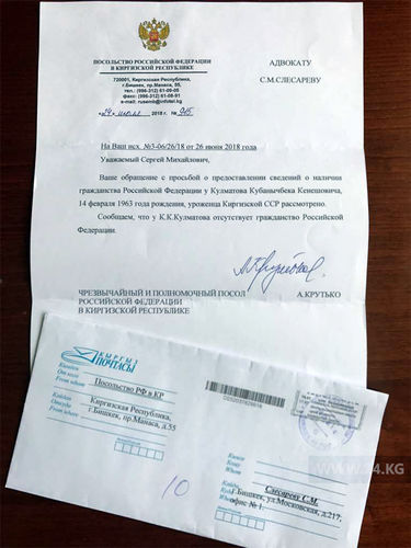 По его словам, в ответе Чрезвычайного и Полномочного Посла РФ Андрея Крутько сказано, что у уроженца Киргизской ССР Кубанычбека Кулматова отсутствует гражданство РФ.