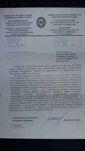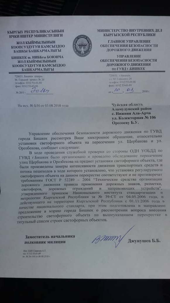 УОБДД по ГУВД Бишкека рекомендует мэрии установить светофор на пересечении улиц Орозбекова и Щербакова. Об этом говорится в письме к местным властям.