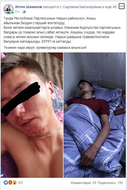 В Нарынской области избили агитатора партии «Республика». Об этом на своей странице в Facebook написал представитель политорганизации Илгиз Шаменов.