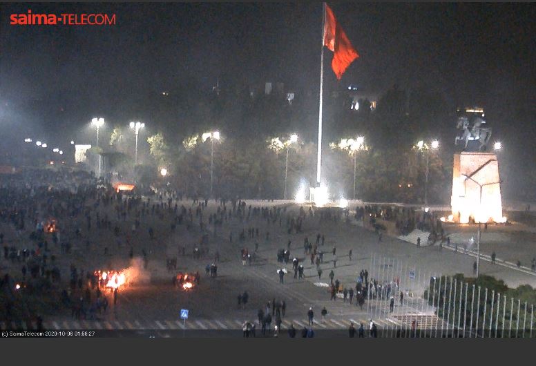 На камере, установленной на площади Ала-Тоо, видно, что митингующие не расходятся. Силовики оттеснили участников беспорядков к ЦУМ «Айчурек», однако они вернулись на площадь.