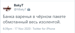 Саперы обнаружили внутри подозрительного пакета, оставленного неизвестным на цокольном этаже ГУМ «Чынар», банку с вареньем. Об этом у себя в микроблоге Twitter сообщил сын Наримана Тюлеева — Бакыт.
