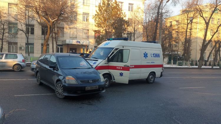 Авария произошла сегодня на пересечении улиц Скрябина и Абдырахманова примерно в 8.50. Водитель машины Honda пересекла двойную сплошную и не пропустила скорую.