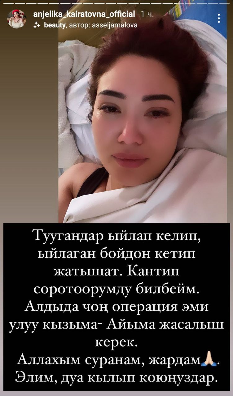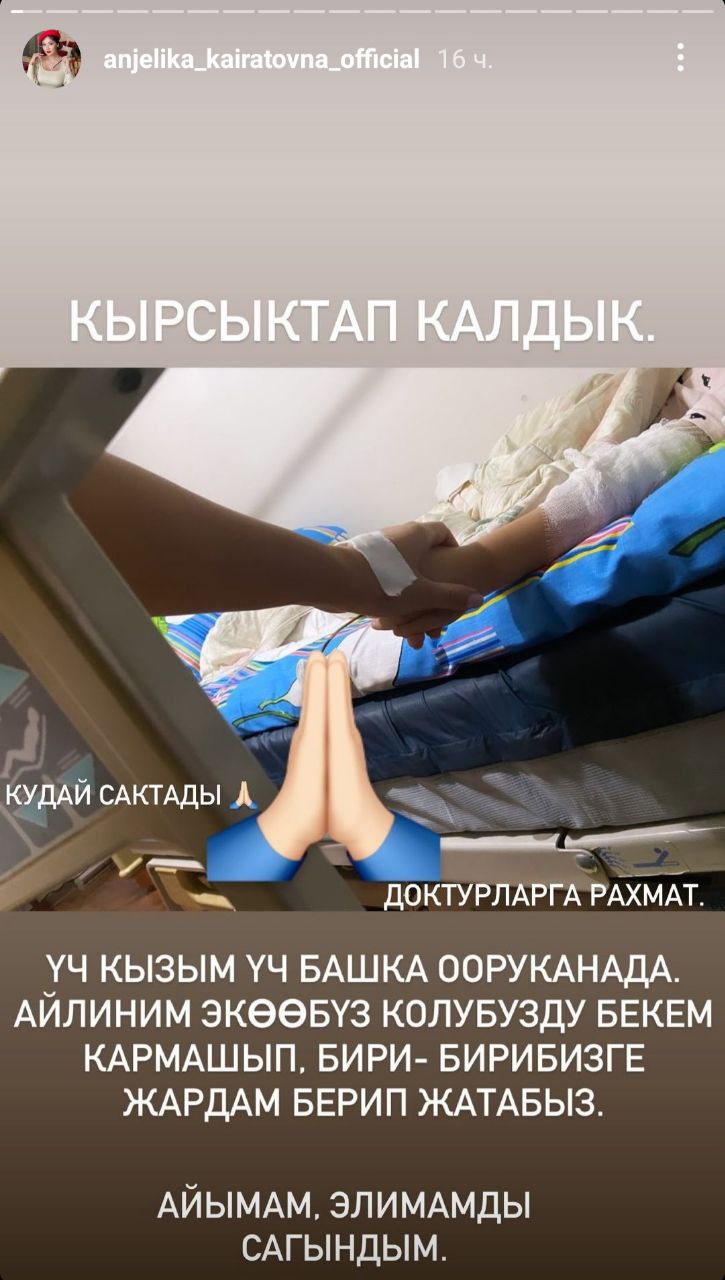«У меня сильно болел позвоночник, но я не могла кричать. Боялась, что дочки испугаются. У Айымки болели рука, нога и позвоночник. Теперь предстоит провести операцию моей старшей дочери Айыме. Когда увидела Элимку (средняя дочь певицы. — Прим. 24-kg.com), я сначала испугалась. Все ее лицо было в синяках, а голова опухшей. В Тюпской больнице сделали рентген Айлин (младшая дочь. — Прим. 24-kg.com). Я не хотела верить в то, что ноги моей дочки будто срубили топором. Не могу отойти от шока», — написала Анжелика.