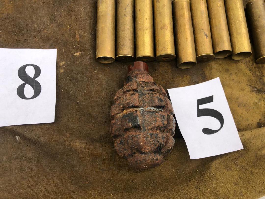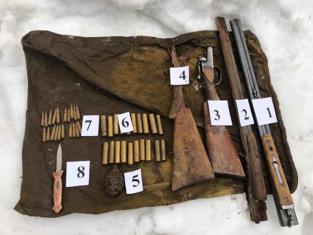 По данным ведомства, в тайнике обнаружены и изъяты ручная граната «Ф-1», два гладкоствольных охотничьих ружья, 40 патронов разного калибра и нож.
