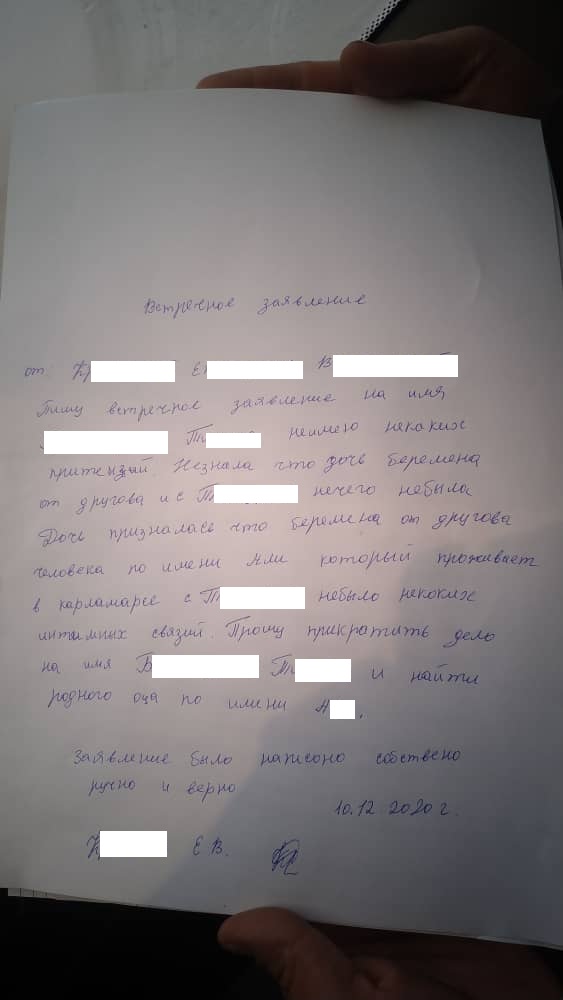 «Спустя некоторое время семья стала просить у меня 10 тысяч сомов, я отказал, ответив, что это будет считаться продажей ребенка. Связь с этой семьей на этом прервалась. Милиционерам она сказала, что забеременела от другого, а я согласен усыновить ребенка. Девочку обманули и заставили написать заявление в отношении меня», — утверждает Темирлан.