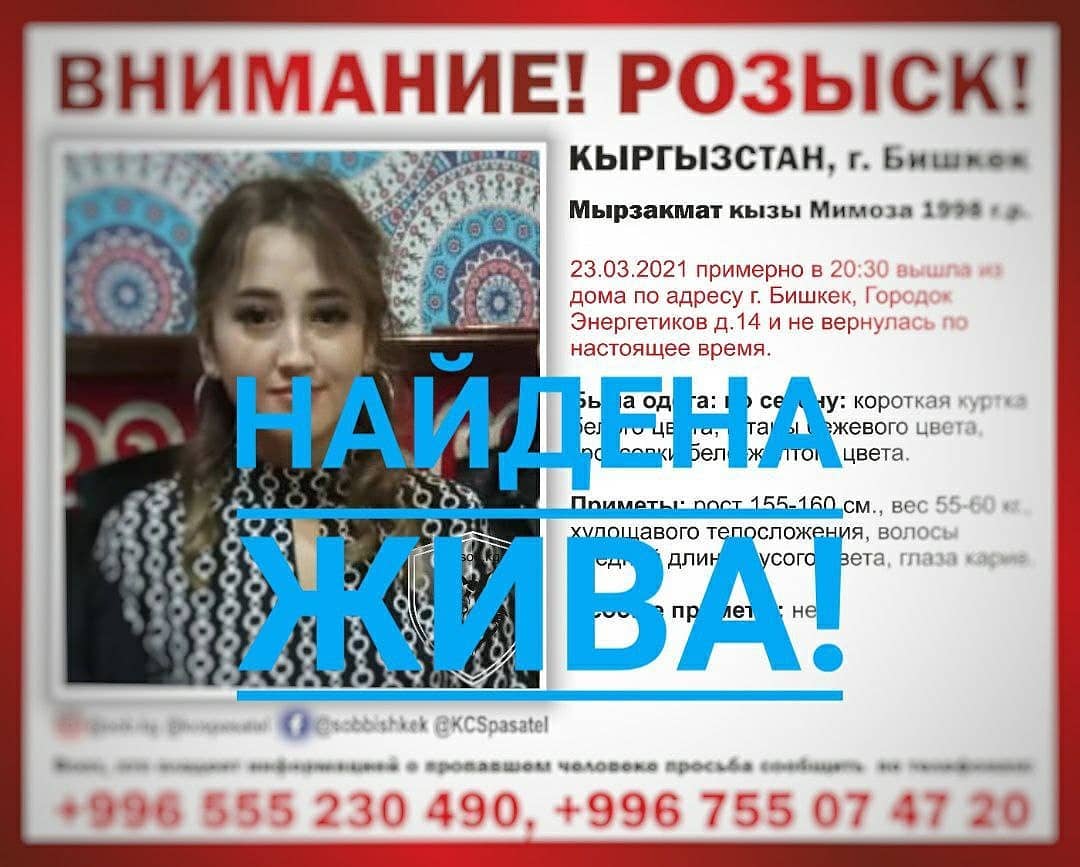 Ранее пропавшую 23-летнюю жительницу Бишкека Мимозу Мырзакмат кызы нашли. Она жива. Об этом сообщили в Совете общественной безопасности.