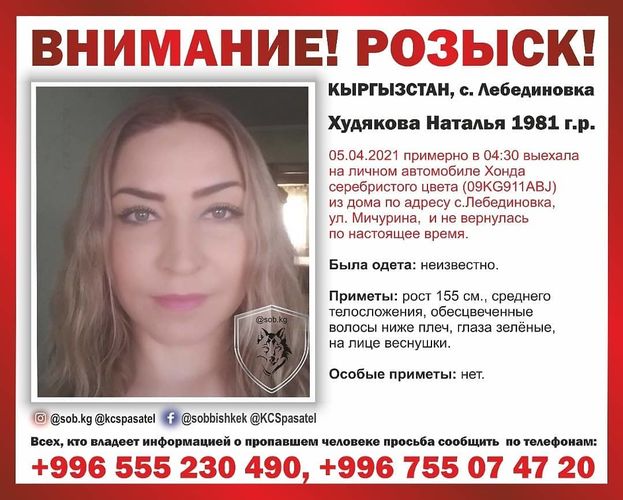 «Утром 6 апреля примерно в 04.30 женщина выехала из дома в селе Лебединовка на машине Honda Odyssey серебристого цвета и не вернулась. Выяснилось, что Наталья Худякова проживала на съемной квартире. Даны ориентировки по всем отделениям милиции Чуйской области и Бишкека. Установлено, что автомашина без вести пропавшей 6 апреля примерно в 18.35 задержана сотрудниками УОБДД в селе Люксембург. Наталья Худякова была в нетрезвом состоянии, о чем составлен протокол от 6 апреля. Автомашина водворена на штрафстоянку в городе Канте, а гражданка отпущена домой. Сейчас ее местонахождение неизвестно, ведутся оперативно-разыскные мероприятия», — сообщили в ГУВД.