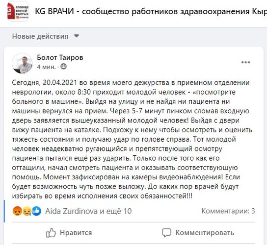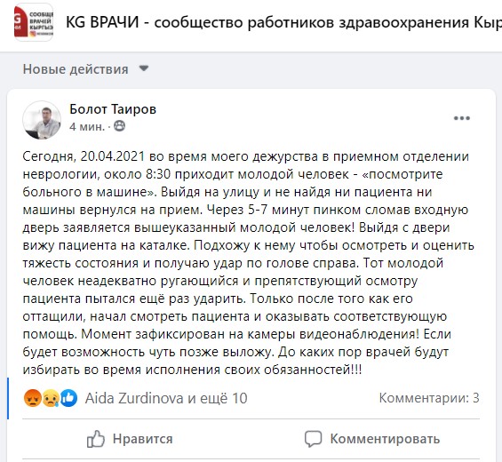 Он отметил, что инцидент зафиксирован на камеры видеонаблюдения. Видео пока в интересах следствия не распространяется. «До каких пор врачей будут избивать во время исполнения своих обязанностей?» — возмутился Болот Таиров.