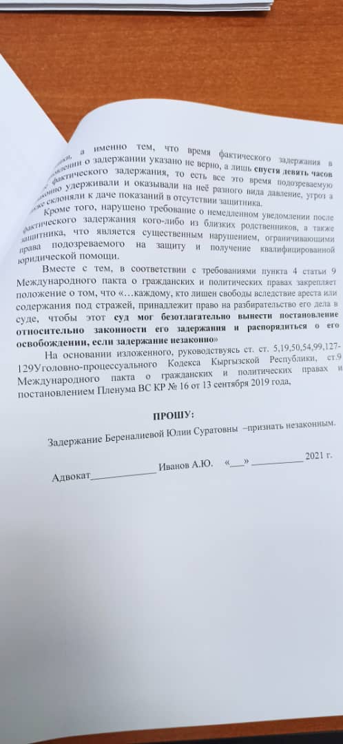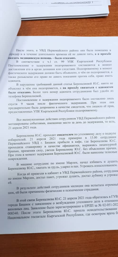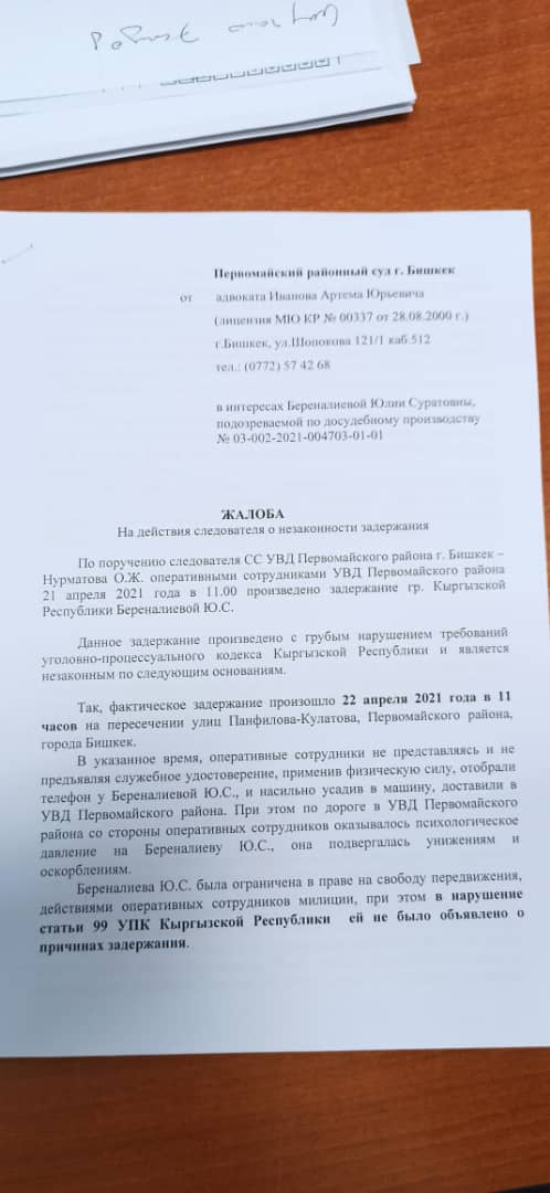 Адвокат задержанной накануне свидетельницы по делу о подкупе избирателей Юлии Б. обратился в суд с жалобой на следователя Первомайского РОВД. Ходатайство направлено в Первомайский районный суд Бишкека.