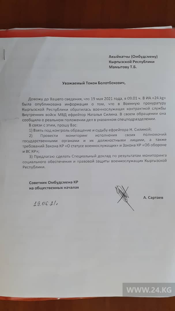Советник омбудсмена и военный правозащитник Анвар Сартаев обратился к Токону Мамытову с просьбой обратить внимание на ситуацию, о которой открыто рассказала ефрейтор Внутренних войск МВД Наталья Силина.