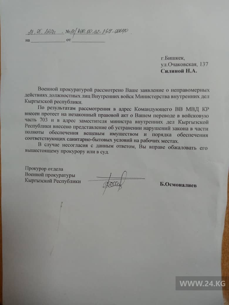 Военная прокуратура признала незаконным приказ командующего Внутренними войсками МВД полковника Исламбека Кенжекулова о переводе ефрейтора Натальи Силиной из Бишкека в Узген. Надзорный орган также потребовал от МВД устранить указанные ею нарушения в части обеспечения военнослужащих и условий их службы. Об этом 24-kg.com сообщила сама Силина.