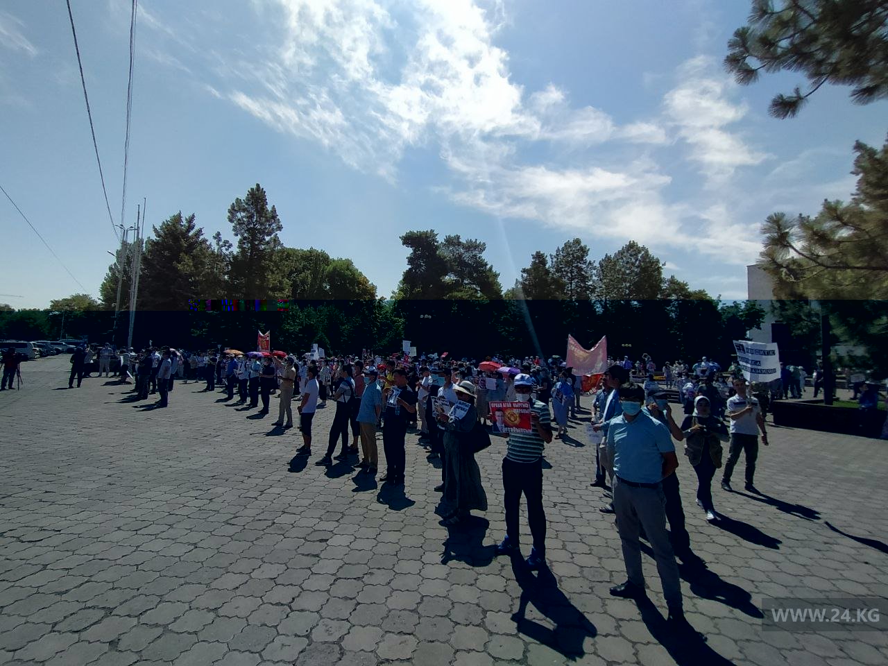 Около 200 участников акции прошли мирным маршем от «Белого дома» до Старой площади, скандируя: «Власти Кыргызстана, найдите учителя!»