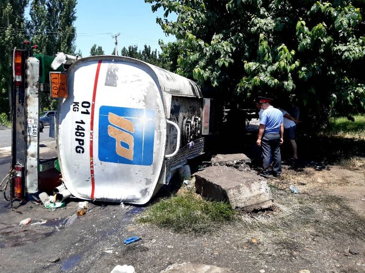 На трассе Бишкек — Ош перевернулся бензовоз. Об этом сообщает пресс-служба МЧС.