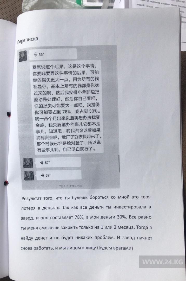 «Находясь в КР, Гу Зун Де попросил мою подзащитную перевести деньги для ведения совместного бизнеса. Хоу Сян перевела $40 тысяч, было куплено оборудование, которое установили в Токмаке. Когда женщина приехала в КР, фирму по производству пластикового шифера переоформили на нее. В 2020 году Гу Зун Де стал вести разгульный образ жизни и супружеские отношения фактически прекратились. Мужчина решил отобрать бизнес», — сказала Халича Зазазова.