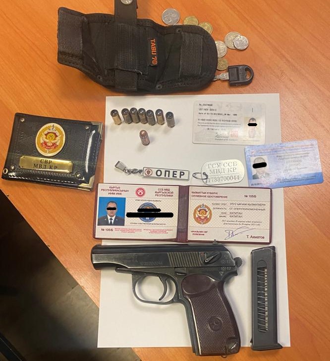 «У задержанного изъят пистолет неустановленной модели с магазином, где было восемь патронов, и удостоверение сомнительного образца. В ходе обыска в машине у подозреваемого найден жилет черного цвета с надписью «МВД». По изъятому оружию и боеприпасами назначена судебно-баллистическая экспертиза. По факту возбуждено уголовное дело по статье «Подделка документов» УК КР. Подозреваемый водворен в ИВС», — сообщили в ведомстве.