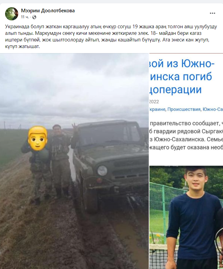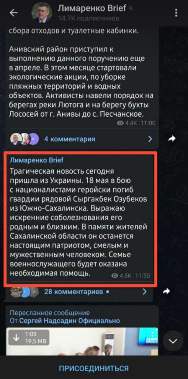 По его словам, 18 мая в бою геройски погиб гвардии рядовой Сыргакбек Озубеков из Южно-Сахалинска. Он выразил соболезнования родным и близким.