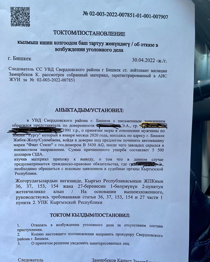 В УВД Свердловского района отказались возбуждать уголовное дело по факту угона двух авто. Об этом 24-kg.com сообщил адвокат Шердор Абдыкапаров.