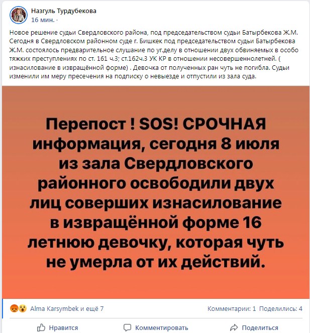 «Сегодня состоялось предварительное слушание по уголовному делу в отношении двух обвиняемых в особо тяжких преступлениях по статье «Изнасилование» УК КР в отношении несовершеннолетней. Девочка от полученных ран чуть не погибла. Судья изменил им меру пресечения на подписку о невыезде и отпустил из зала суда», — написала Назгуль Турдубекова.