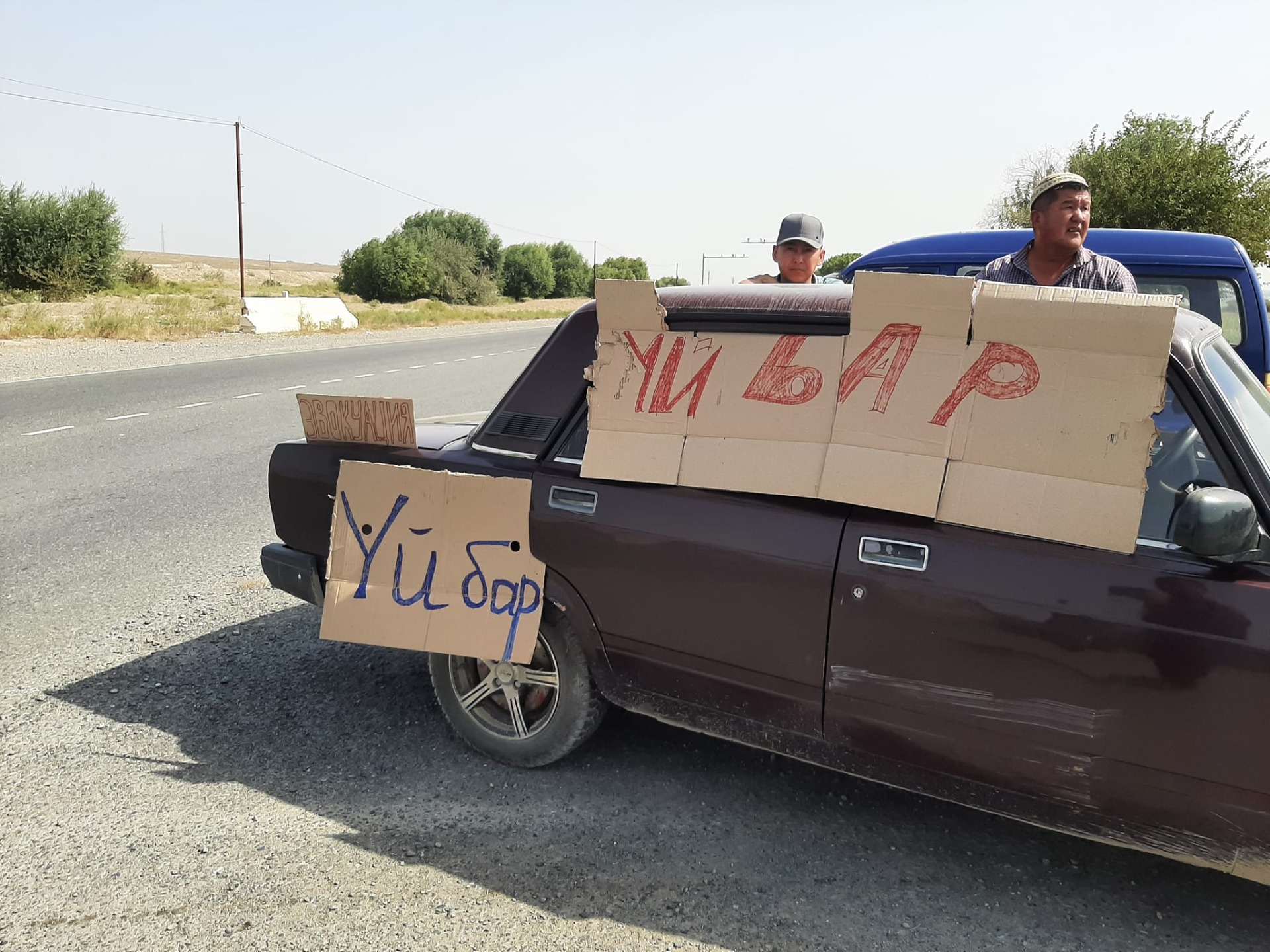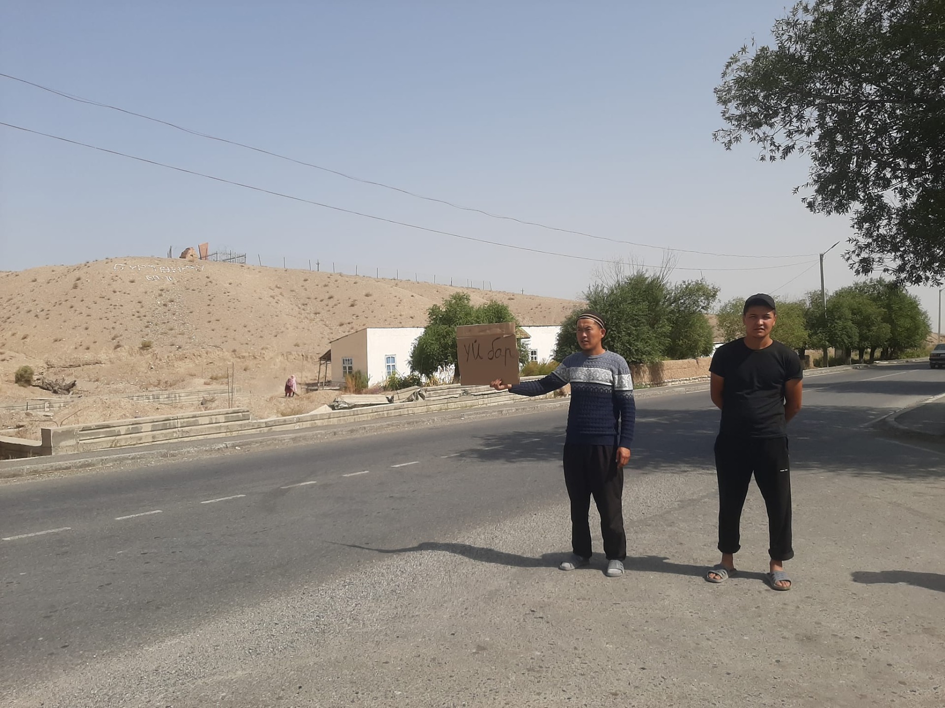 На кадрах мужчины держат плакаты с надписью: «Үй бар» («Дом есть»).