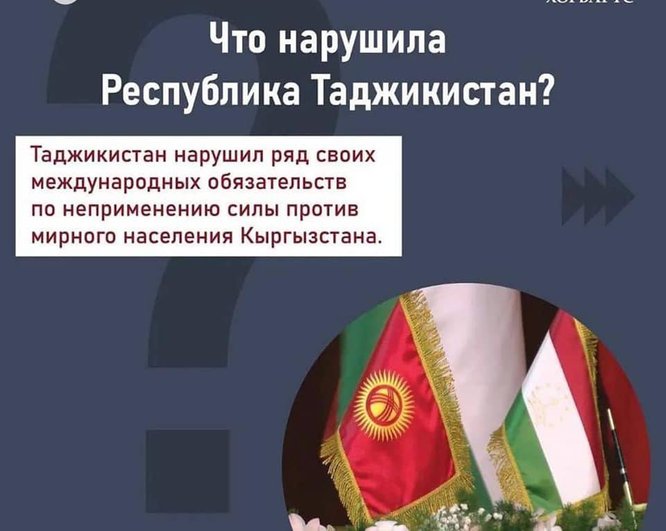 Вторгшись на территорию суверенного и независимого Кыргызстана, Таджикистан нарушил свои обязательства по неприменению сил против мирного населения КР.