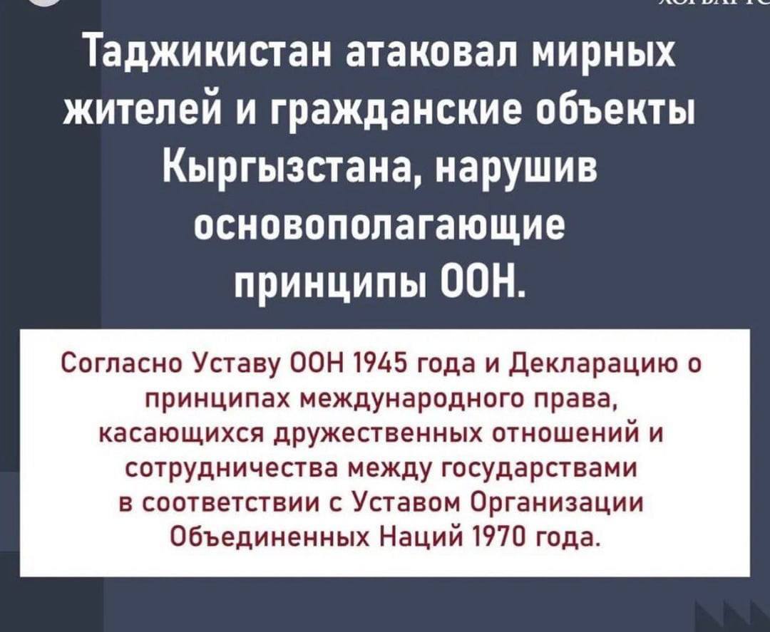 В социальных сетях распространяют информацию о том, какие нормы проигнорировал Таджикистан, начав стрельбу по селам и погранзаставам Кыргызстана. В частности, нарушены основополагающие принципы ООН и резолюция 3314 (определение агрессии) Генеральной ассамблеи ООН, а также основные нормы гуманитарного права.