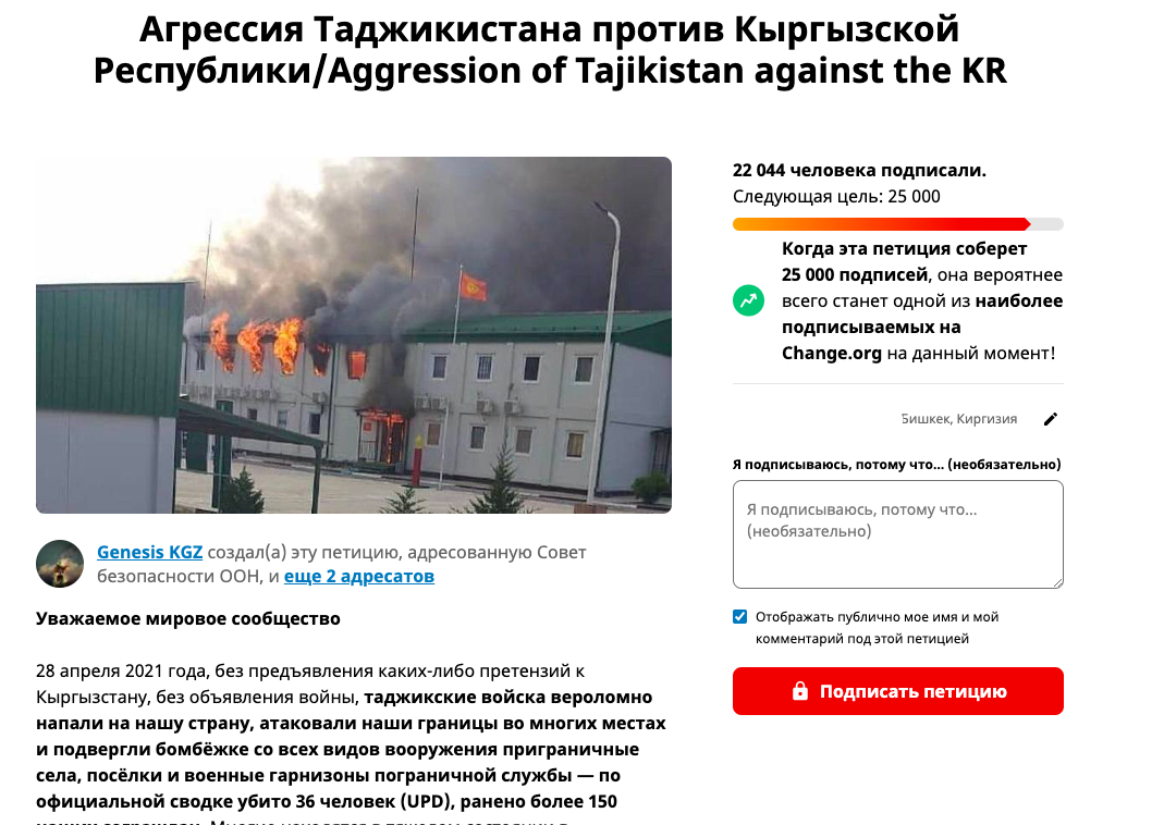 Кыргызстанцы призывают мировое сообщество дать объективную оценку действиям РТ, возобновлен сбор подписей за петицию «Агрессия Таджикистана против Кыргызской Республики» на change.org.«Одной из монументальных черт народа КР является стремление к миру и согласию и внутри страны, и с соседними государствами. Мы терпеливы, но справедливы в своих решениях и действиях, давая достойный отпор врагам. Мы призываем мировое сообщество дать объективную оценку вероломным действиям властей Таджикистана, развязавших военный конфликт 14 сентября 2022 года на кыргызско-таджикской границе, переросший 16 сентября в полномасштабную военную агрессию», — говорится в сообщении.