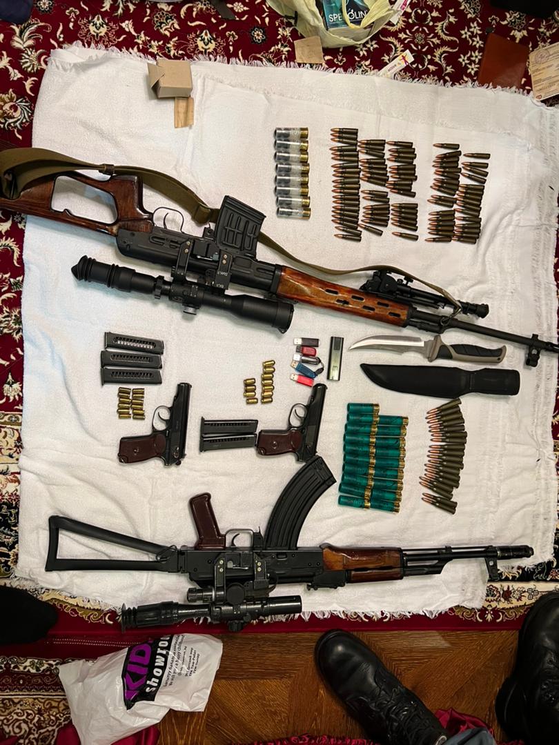 В машине задержанного при обыске обнаружили пистолет Макарова, в доме — снайперскую винтовку Драгунова, карабин «Сайга», еще один пистолет, больше ста патронов разного калибра и нож.
