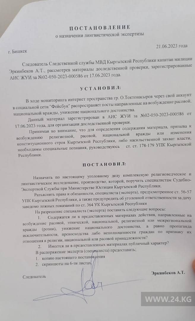 «Из документов следует, что Ондуруш Токтонасыров пишет в своем аккаунте Facebook посты, направленные на межнациональную рознь. Это сотрудники милиции увидели в ходе мониторинга социальных сетей. Факт они зарегистрировали сначала в журнале учета информации, а затем возбудили дело и назначили экспертизу. Мы еще не ознакомились с ее материалами», — сказал Жаныш Бараков.