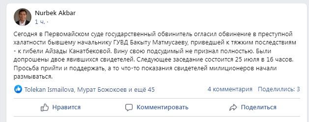 В Первомайском районном суде Бишкека началось судебное разбирательство в отношении экс-главы ГУВД Бакыта Матмусаева. Об этом на своей странице в Facebook сообщил адвокат Нурбек Токтакунов.