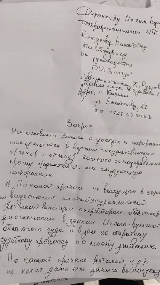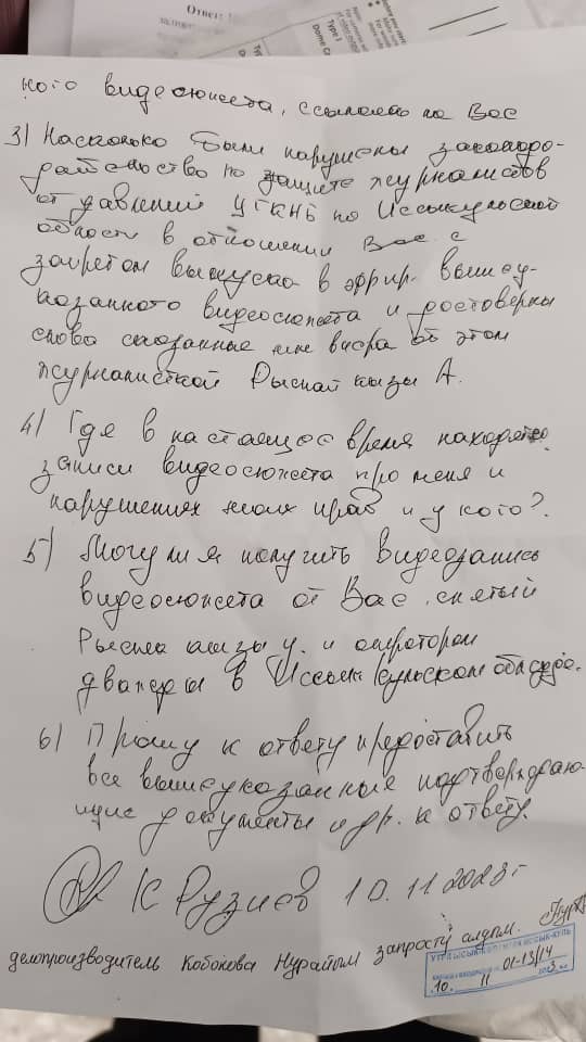 Он предоставил редакции письмо, которое полномочный представитель президента в Иссык-Кульской области направил прокурору региона Бектену Жолдошеву. В нем говорится, что правозащитник обратился к полпреду с жалобой на нарушение его конституционных прав и свобод «в связи с запретом со стороны УГКНБ по Иссык-Кульской области по выпуску в эфир областного телевидения сюжета про судебные процессы».