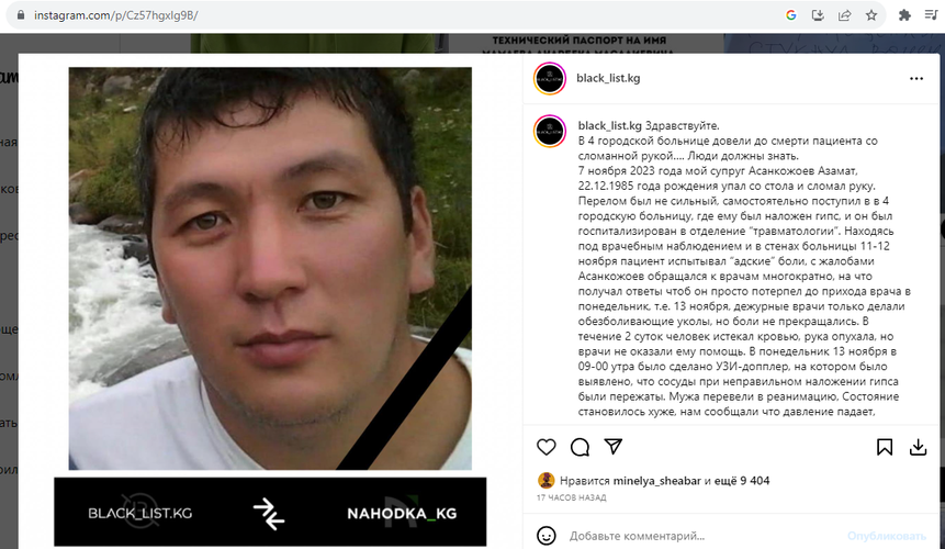 «Он был госпитализирован в отделение травматологии. 11-12 ноября пациент испытывал адские боли, с жалобами обращался к медикам многократно, на что получал ответы, чтобы потерпел до прихода врача в понедельник, 13 ноября. Дежурные врачи только делали обезболивающие уколы, но боли не прекращались. В течение двух суток человек истекал кровью, рука опухала, но врачи не оказали ему помощь. 13 ноября на УЗИ выявили, что сосуды при неправильном наложении гипса были пережаты. Пациента перевели в реанимацию, состояние ухудшалось. Во вторник руку ампутировали, а в тот же вечер больной умер», — говорится в сообщении.