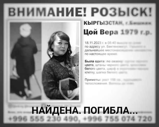 Пропавшую в ноябре Веру Цой нашли погибшей. Об этом сообщается на странице Совета общественной безопасности КР в Facebook.
