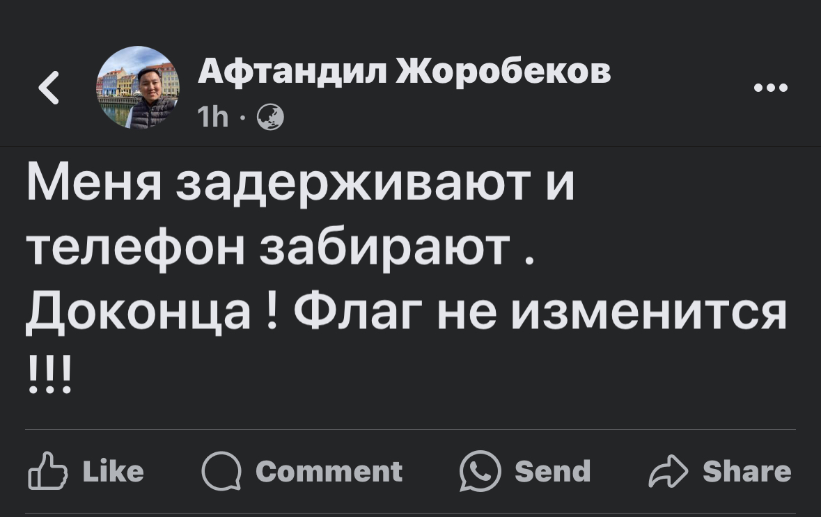 Задержан активист и администратор страницы в соцсетях «Беспредел.kg» Афтандил Жоробеков. Об этом он написал на свой странице в соцсетях.