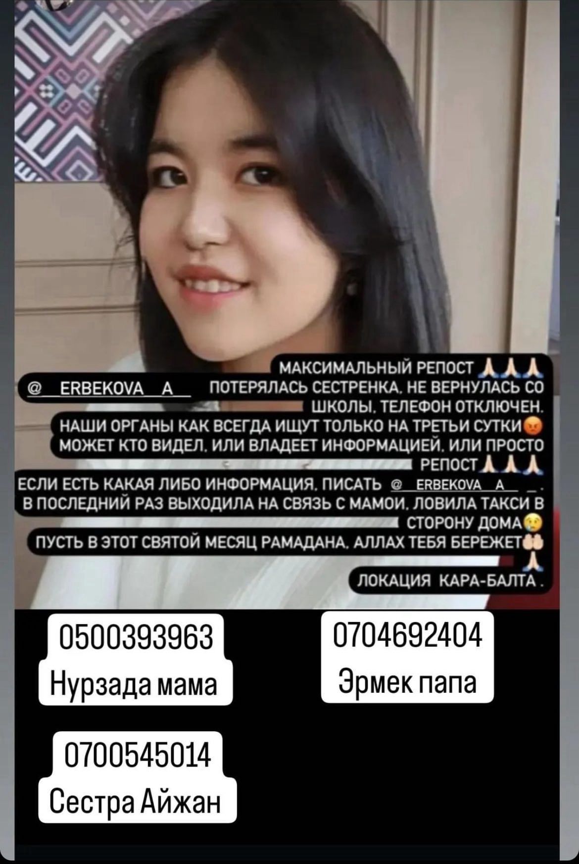 В Жайылском районе пропала 15-летняя Адинай Самудинова. Об этом сообщает пресс-служба ГУВД Чуйской области.