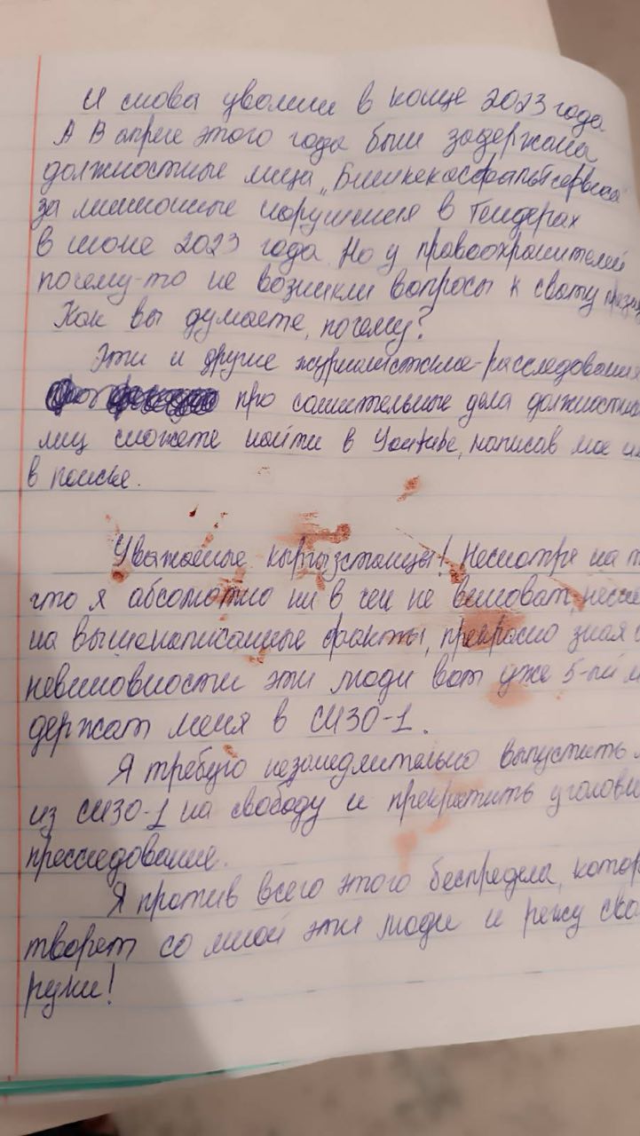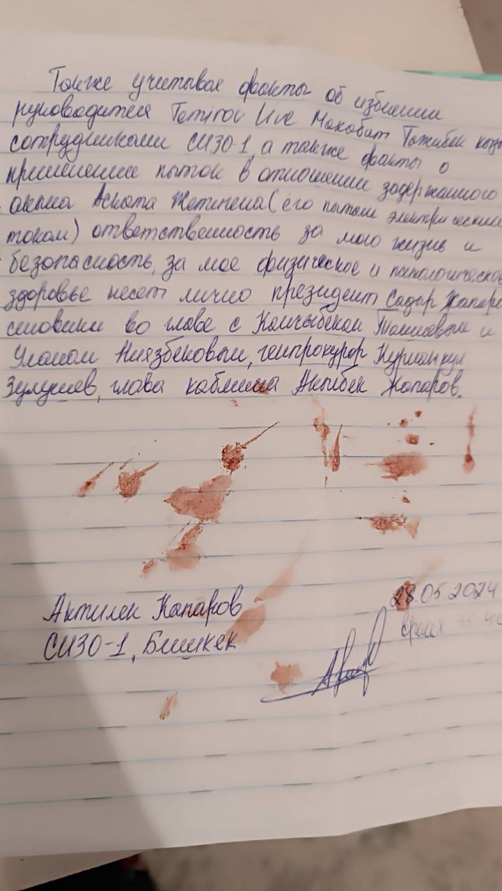 Отметим, журналист-расследователь Болот Темиров сообщал, что в бишкекском СИЗО-1 избили его супругу и других сокамерниц. Махабат Тажибек кызы написала заявление, в котором рассказывает, как подвергалась издевательствам со стороны надзирательницы Айпери Джекшеновой.