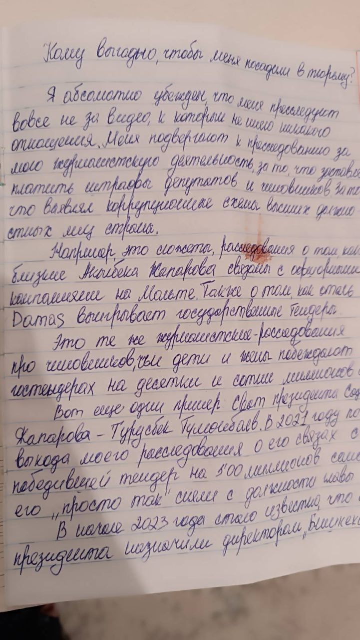 Один из 11 задержанных журналистов-расследователей Актилек Капаров написал письмо-обращение из СИЗО. Оно попало в распоряжение «Азаттыка» через коллег Капарова.
