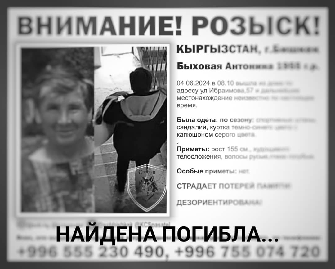 Ранее отмечалось, что пенсионерка вышла из дома в Бишкеке 4 июня примерно в 8.10. Она страдала потерей памяти.