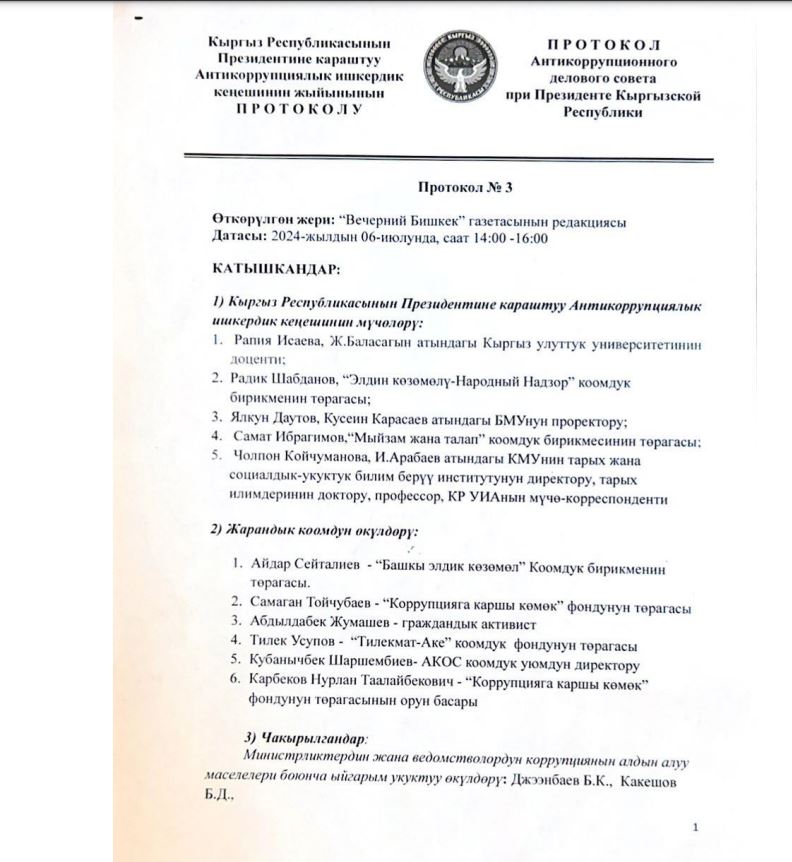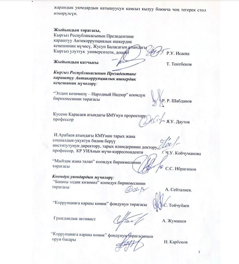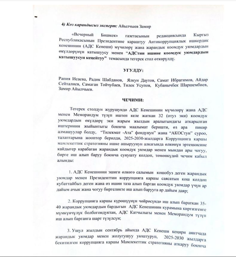 Между тем члены Антикоррупционного делового совета редакции сообщили, что председатель ОФ «Тилекмат Ата» Тилек Усупов преследует личные интересы и вводит общественность в заблуждение. Обсуждаемую резолюцию участники круглого стола не принимали.