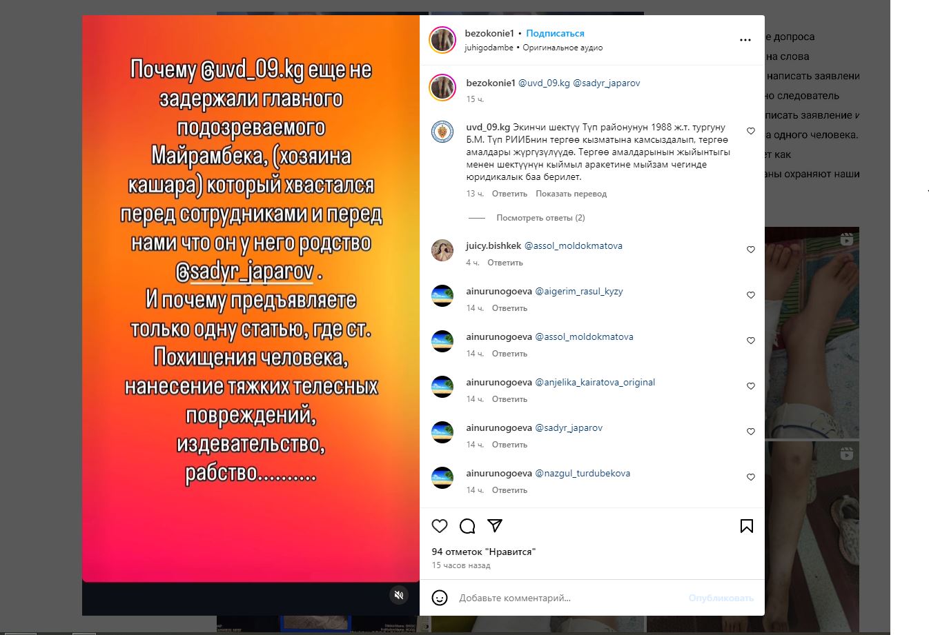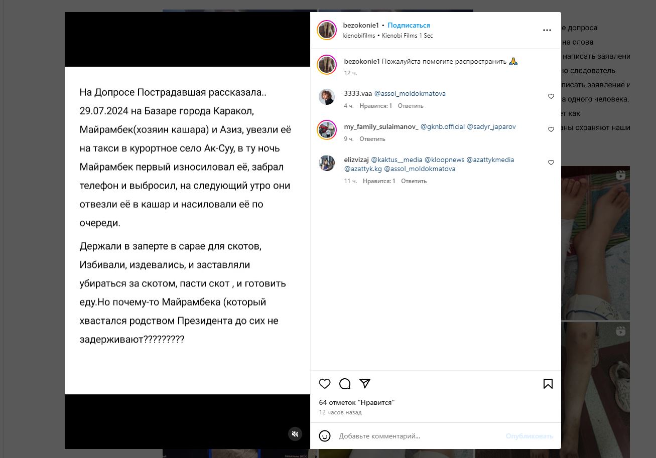 «Сестренку трое суток нacилoвaли, избивaли, держали взаперти в сарае, заставляли пасти скот и готовить еду. У нее сотрясение мозга, сломали ногу, на теле нет ни единого живого места. Мы сами нашли сестренку на джайлоо в Токтояне. Во время задержания подозреваемые были пьяны», — написали родственники.