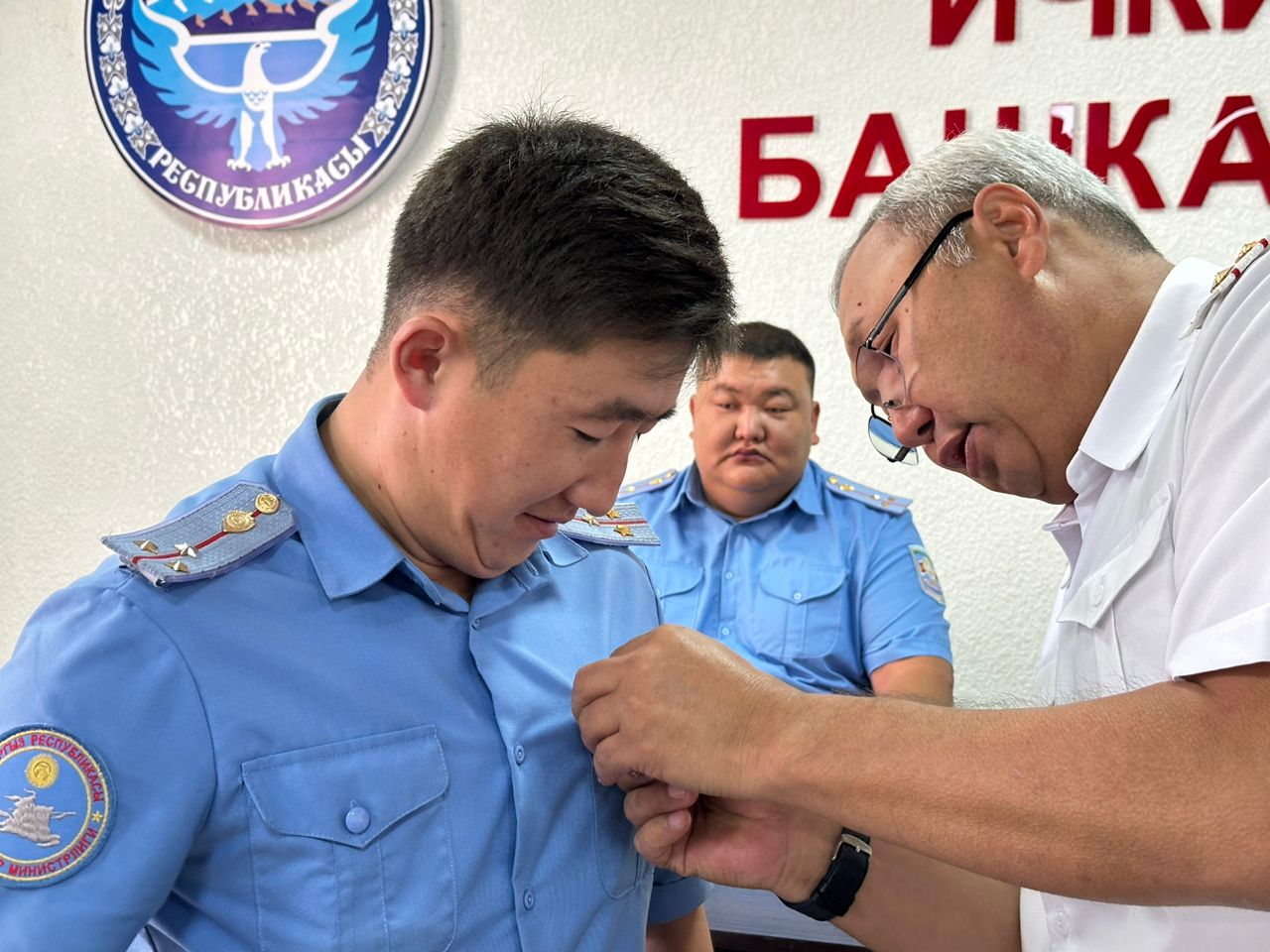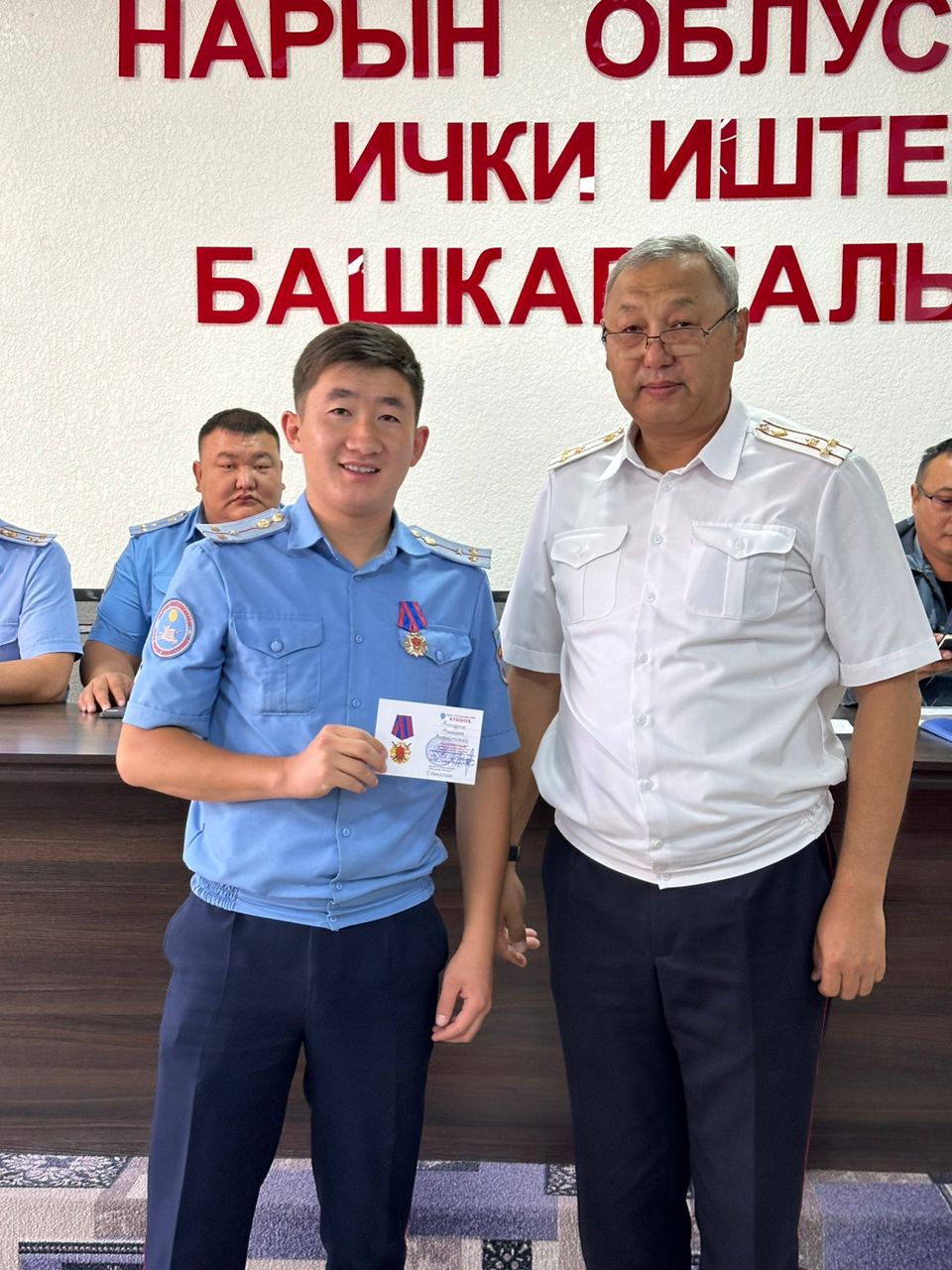 Сегодня, 4 сентября, начальник УВД Нарынской области Сапар Асаналиев наградил милиционера медалью «Каармандык» и поблагодарил его за качественное и мужественное несение службы.