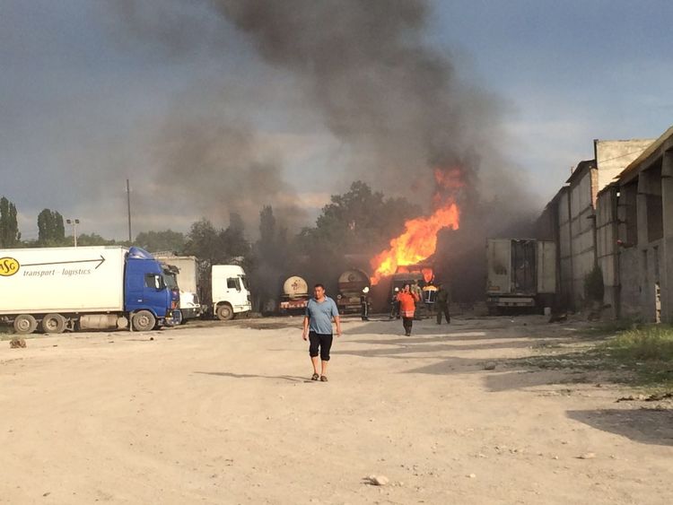 Возгорание емкостей с бензином и газом произошло на территории бетонно-растворного завода. По словам сотрудников милиции, водитель большегрузной машины подъехал заправиться, другой завел машину. В результате произошел взрыв.