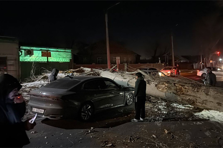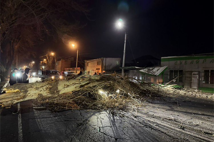 В Бишкеке ночью на улице Элебесова упал крупный тополь и при падении задел проезжавшую мимо машину. Фото происшествия очевидцы опубликовали в социальных сетях.