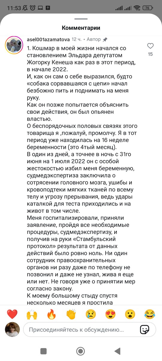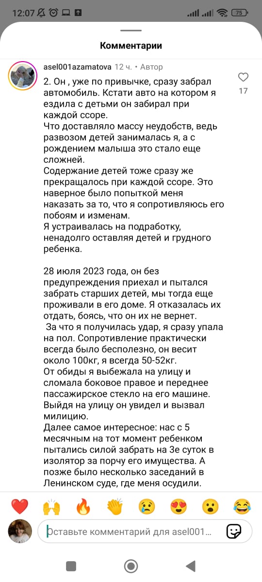 Асель Азаматова отметила, что последнее заявление в правоохранительные органы она написала 6 апреля 2024 года — по факту жестокого избиения на глазах у троих детей. Судмедэкспертиза тогда подтвердила наличие гематом, кровоподтеков по всему телу и залысины на голове из-за вырванных клочков волос.