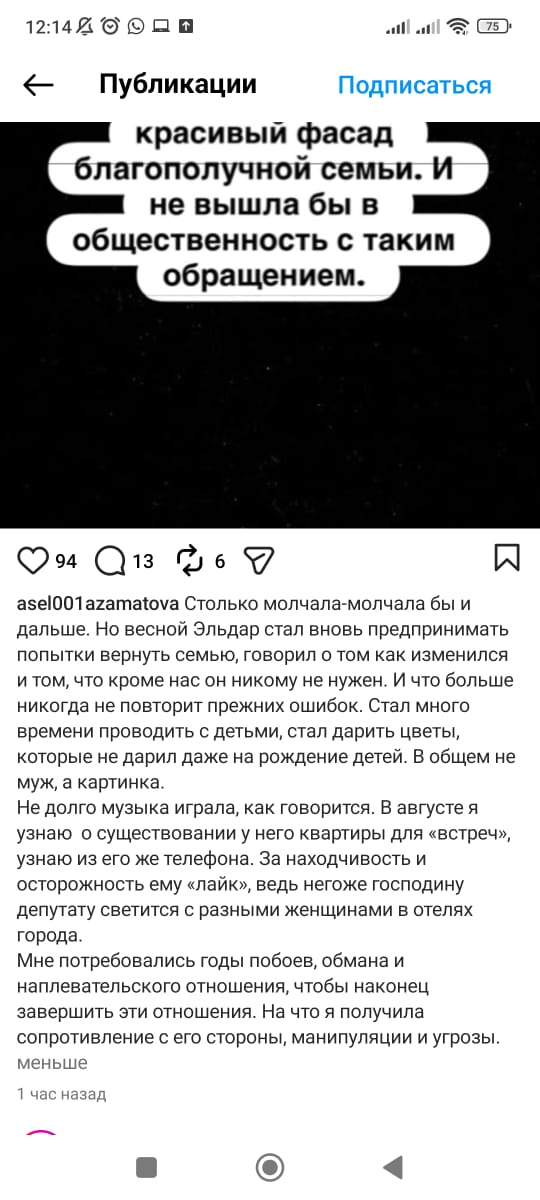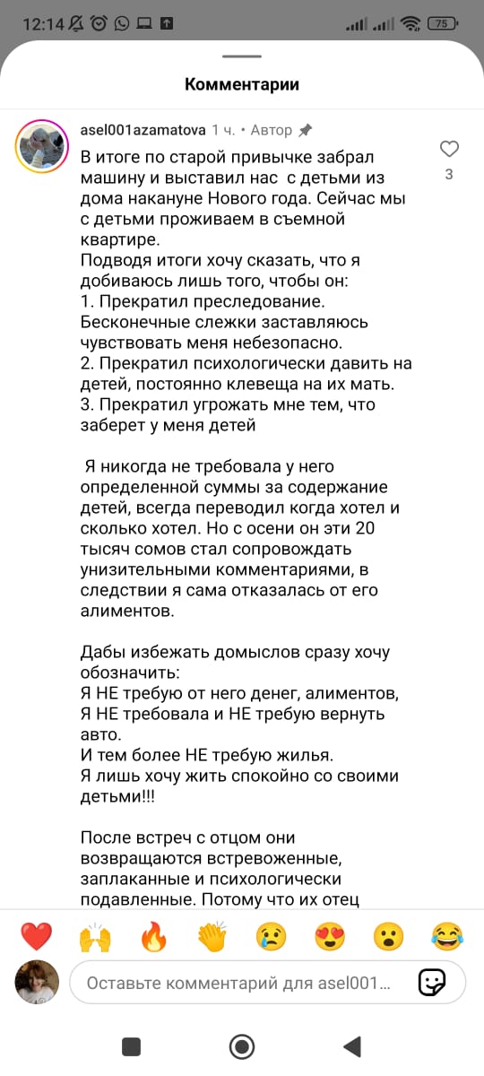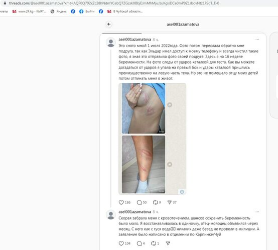Пользовательница соцсетей Асель Азаматова (asel001azamatova) распространила пост-крик о помощи. По ее словам, она является бывшей супругой Эльдара Сулайманова — ныне депутата Жогорку Кенеша.