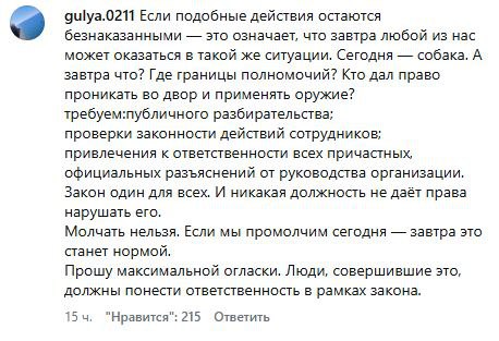 • «Если подобные действия остаются безнаказанными, это означает, что завтра любой из нас может оказаться в такой же ситуации. Сегодня — собака. А завтра что? Где границы полномочий?» — пишут в соцсетях.