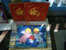 К сожалению, изделия расположить на аллее негде, кроме как на скамеечках. Но все равно интерес к ним большой. Вот войлочные куколки, сумочки, сувенирные юрты. Их привезли из села «Дон-Арык» Чуйской области. Соцработник Гульмира Суйналиева из федерации «Баласагын» рассказывает, что, как могут, они стараются веселить аксакалов и апашек: то чаем напоить, то отвезти куда-нибудь на отдых. А мастерицы Тарындык и Умут, приехавшие из Тонского района Иссык-Кульской области (федерация «Ырыскы»), не без гордости показали изумительные ширдаки, рассказывая, что посещали семинары, чтобы подучиться и поднять качество изделий.