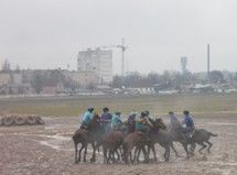 Бросили тушу овцы в круг. Кони месят грязь, и всадники бьются за извалявшуюся в жиже добычу. Один пытается схватить, другой мешает. Забава не для сибаритов! Минут 10 толкались, наконец один силой взвалил ее на коня, прижал ногой и ринулся к воротам. Но не тут-то было! Метров 30 проскакал, и его настигли.