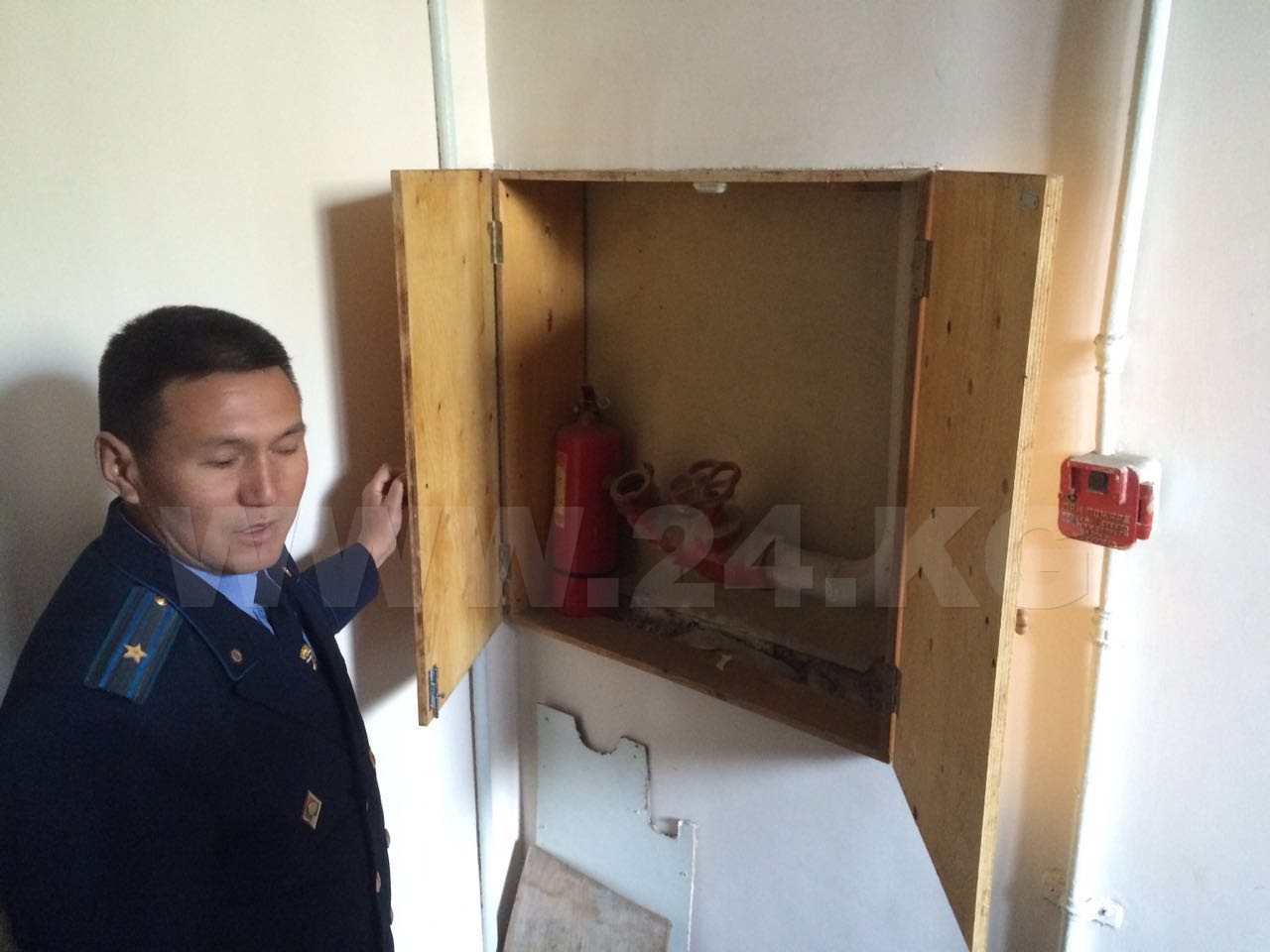 Внутри объекта дела не лучше: сплошь нарушения противопожарной безопасности. Заведующий отделом Гостехинспекции Бейшенбай Акматалиев показал журналистам противопожарный кран, однако необходимых комплектующих к нему не оказалось.