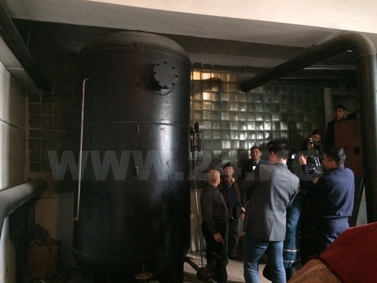 Проверяющих и журналистов у входа в Театр оперы и балета встретил начальник пожарно-сторожевой охраны Бердибек Акматалиев. Прежде чем зайти в здание, он решил показать резервуар с водой, из которого в случае пожара огнеборцы будут ее брать.